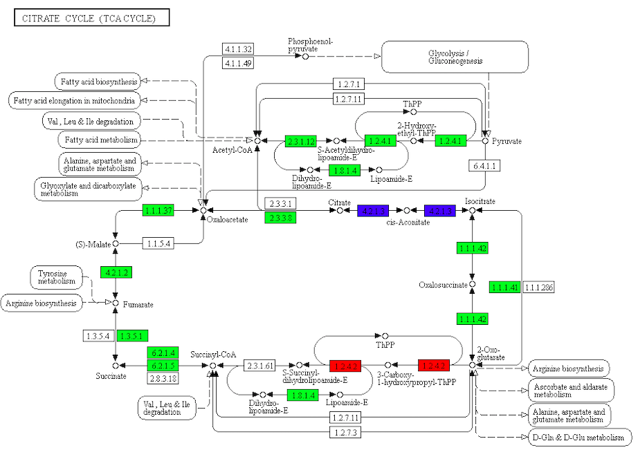 差異代謝物分析結果結合轉錄組差異基因分析結果,將相同分組的差異基因及差異代謝物同時映射到KEGG通路圖上,用綠色和紅色標注基因或代謝物表達量顯著下調或上調的節(jié)點,藍色標注既有上調又有下調的基因,更好的了解基因與代謝物之間的關系。