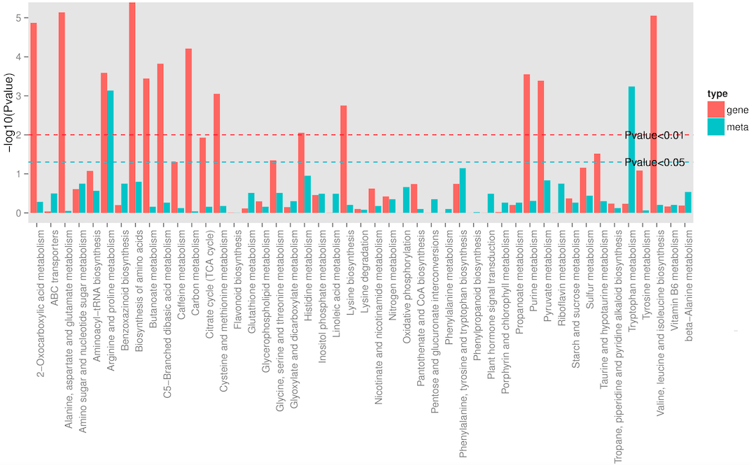 進行KEGG注釋時,差異代謝物與差異基因同時注釋的通路往往有很多。這種情況下,挑選基因和代謝的通路富集系數pvalue<0.05優(yōu)先進行分析,這樣可以節(jié)約篩選數據的時間,快速找到與研究目的相關的通路進行后續(xù)分析。