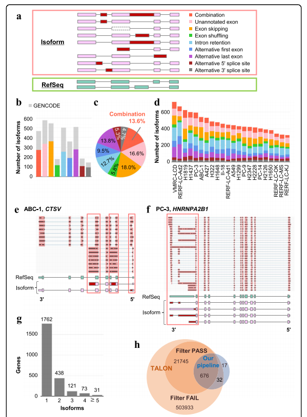 文章鑒定了轉錄異構體的完整外顯子-內含子結構,并將其分為以下類型:未標記外顯子、外顯子跳躍、互斥外顯子、內含子保留、5’可變外顯子和3’可變外顯子(圖 1a)。因此,文章從所有細胞系中鑒定出3474種非RefSeq亞型,并將它們命名為假定的“異常剪接亞型”,以下簡稱為“亞型”,2021種亞型包含至少一個在參考序列或基因代碼數(shù)據(jù)集中沒有出現(xiàn)的剪接事件(圖1b)。還在單個全長轉錄本上鑒定了這些剪接事件的新組合,這很難通過短reads測序數(shù)據(jù)的片段reads檢測到。