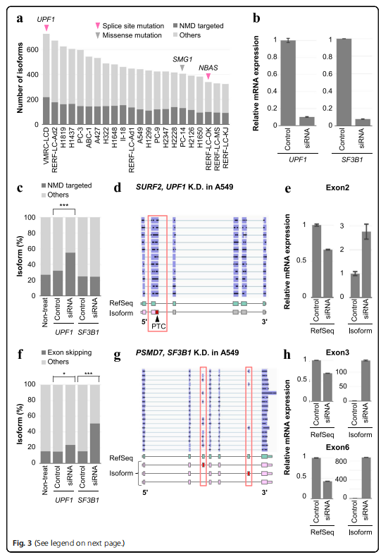SF3B1是一種眾所周知的剪接因子,在多種疾病中發(fā)生突變,并導致異常剪接亞型的增加。作者通過SF3B1敲除評估剪接損傷的影響以及研究剪接因子的畸變是否影響轉錄本的產生。作者發(fā)現(xiàn)外顯子跳躍的比例顯著增加(圖3f),例如,PSMD7的外顯子3和6 在敲除后被改變(圖3g)。SF3B1-depleted的A549細胞中,外顯子跳躍亞型的表達PSMD7在中顯著增加,相反,RefSeq類型減少。為了確認剪接位點近端區(qū)域的共有序列,作者收集了僅在SF3B1在A549細胞中敲除檢測到的外顯子跳躍異構體。在這項分析中,作者用新的剪接連接的10 bp的區(qū)域,并跳過了外顯子。具有外顯子跳躍亞型的基因在翻譯和泛素-蛋白酶體途徑中顯示出顯著的富集,因此,這些因素的中斷可能會改變至少一些異常剪接亞型,并可能導致它們在肺癌細胞中的積累。