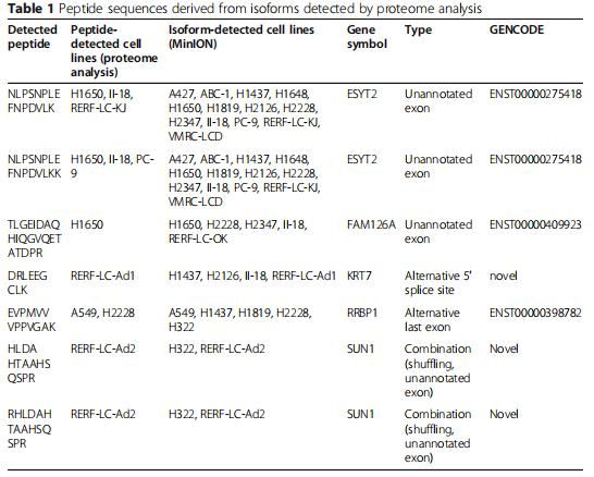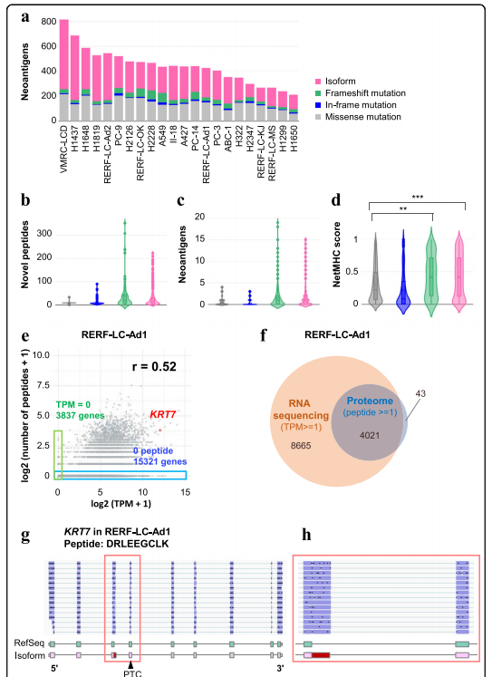 為了從實驗上驗證異常的轉錄本是否被翻譯成蛋白質,對11種細胞系(A427、A549、H1650、H2228、II-18、PC-9、RERF-LC-Ad1、RERF-LC-Ad2、RERF-LC-KJ、RERF-LC-MS和VMRC-LCD)采用了使用液相色譜結合串聯(lián)質譜(LC/MS/MS)對于多肽識別,作者基于每個細胞系的MinION數(shù)據(jù)定制了肽序列數(shù)據(jù)庫。如前所述,普通轉錄組測序由于其測序能力,顯示出比LC/MS/MS蛋白質組學更高的基因覆蓋率。通過液相色譜/質譜/蛋白質組學檢測的每個基因的肽數(shù)與通過轉錄組測序數(shù)據(jù)計算的TPM相關(r= 0.52,圖4e)而且LC/MS/MS蛋白質組學檢測到的大部分基因也被轉錄組測序覆蓋(圖4f)。作者成功地檢測到7個翻譯自異常剪接亞型特異性區(qū)域的多肽。例如,衍生自外顯子3中具有選擇性5’剪接的轉錄本的多肽KRT7存在于RERF-LC-Ad1(圖4g)。在GENCODE數(shù)據(jù)庫中沒有發(fā)現(xiàn)這種轉錄本,但是在ENST00000547613中觀察到了這種同中型特異性連接,其被認為是處理過的轉錄本。MinION也證實了在H1437、H2126和II-18中的表達(表1).此外,這種轉錄本有可能產生幾個新抗原,這些新抗原是由NetMHC預測的。這些結果表明,一些異常剪接亞型被真正翻譯成肽,并可能在癌癥中產生新抗原中發(fā)揮作用。