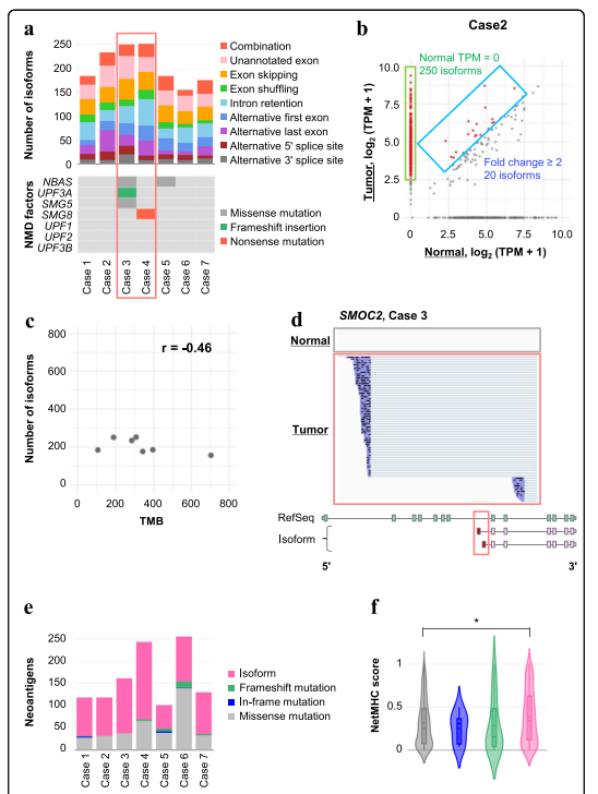 為了檢查體內癌細胞中是否也存在異常剪接轉錄本,作者接下來分析了臨床肺癌標本。應用與臨床樣本細胞系分析相同的分析方案,能夠識別每個患者的異常剪接亞型(圖5a)。作者選擇了在腫瘤樣本中表達水平比非腫瘤樣本高至少兩倍的轉錄本(圖5b)在所有臨床樣本中鑒定出982種富含癌癥的剪接亞型。其中,448種亞型在參考序列或基因代碼。異常亞型的數(shù)量和TMB之間沒有顯著的相關性(圖5c)。作為檢測到的轉錄本的一個例子,在SMOC2如圖1所示5d和僅在病例3的腫瘤中表達。類似于細胞系分析的結果,作者可以識別獨立剪接事件的幾種獨特組合模式,這些模式占這些未標記亞型的14.5%。還確定了保留在癌細胞中的潛在的NMD靶向亞型,這表明NMD機制在相應的癌癥中被破壞。值得注意的是,在病例3和4中,發(fā)現(xiàn)*大數(shù)量的潛在NMD靶向亞型在關鍵NMD因子中存在移碼或無義突變,UPF3B和SMG8(圖5a)。