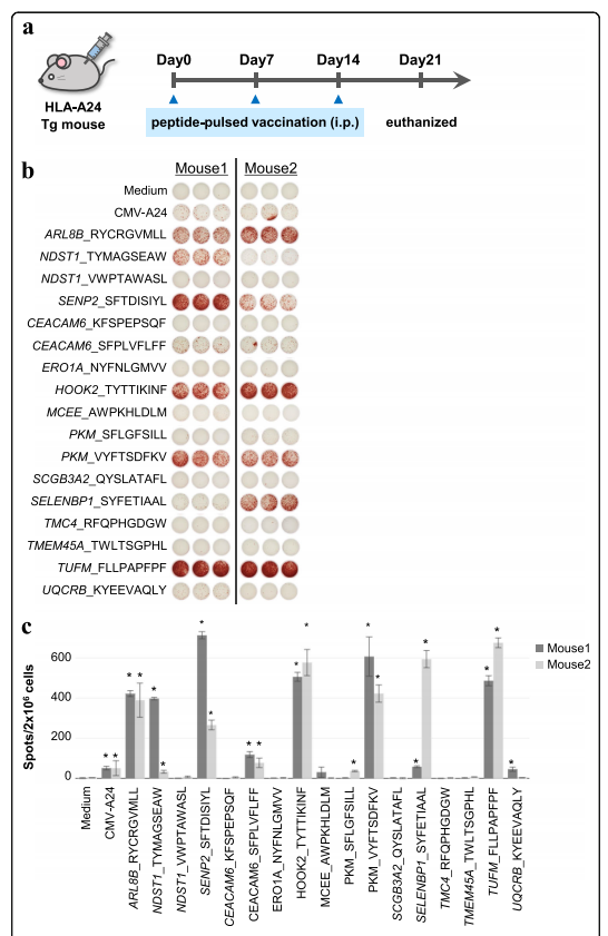 為了評估從異常剪接亞型和移碼突變中鑒定的肽的抗原性,作者根據(jù)圖6a所示的方案用候選肽免疫HLA-A24轉基因小鼠。作者根據(jù)人類白細胞抗原-α:24:02的網(wǎng)絡MHC評分選擇了17種候選肽(表2)。作者通過BLAST-P證實了該肽序列與人或小鼠蛋白質數(shù)據(jù)庫中的序列沒有相似性,最后一次接種疫苗一周后,作者從小鼠中分離出脾細胞,并對分離物進行酶聯(lián)免疫吸附斑點(ELISpot)分析。通過這樣做,作者試圖檢測新抗原特異性脾淋巴細胞反應。酶聯(lián)免疫吸附試驗結果顯示,17個多肽中有8個誘導顯著高的干擾素-γ產生(n= 2)與PBS組和單獨佐劑組相比(圖6b,c)。這些結果表明,來自剪接亞型和移碼突變的多肽可以通過與人類白細胞抗原的相互作用激活T細胞反應。
