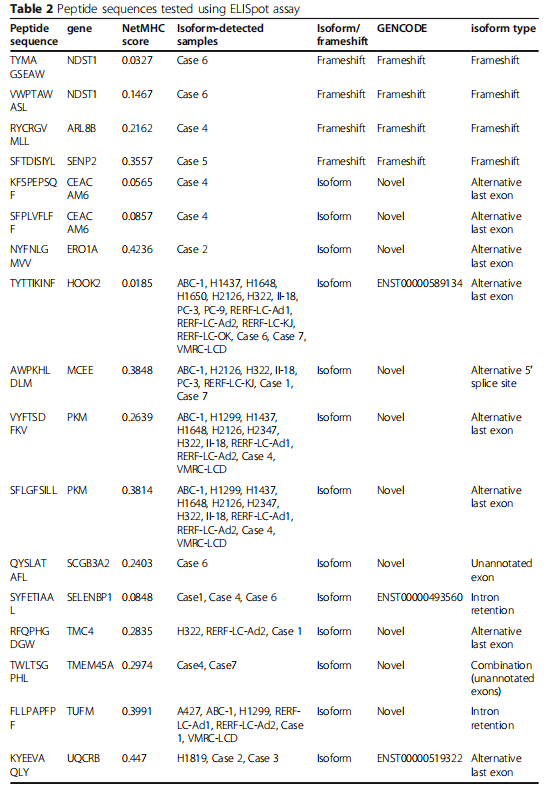 結果:對22組細胞系進行全長轉錄組測序,共鑒定出2021種新的剪接異構體。其中一些異構體的蛋白質表達通過蛋白質組分析進行驗證。無義介導的mRNA衰減因子(NMD)UPF1的降低和剪接因子SF3B1的減少增加了異常轉錄本的比例。NetMHC對每種HLA分子結合的親和力的評估顯示,一些亞型可能產生新抗原候選體,還在7個非小細胞肺癌標本中發(fā)現(xiàn)了剪接亞型。酶聯(lián)免疫吸附斑點試驗表明,大約一半的候選肽有可能通過與人類白細胞抗原分子的相互作用激活T細胞反應。大約一半的多肽通過與HLA分子的相互作用具有激活T細胞反應的潛力。最后,作者通過參考構建的目錄來估計癌癥基因組圖譜(TCGA)數(shù)據(jù)庫中的亞型數(shù)量,發(fā)現(xiàn)NMD因子的破壞與TCGA-Lung Adenocarcinoma數(shù)據(jù)集中發(fā)現(xiàn)的剪接亞型數(shù)量顯著相關。