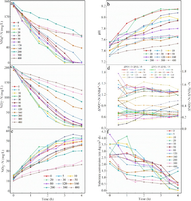 如圖3d所示,ΔNO2–N/ΔNH4+-N 和ΔNO3–N/ΔNH4+-N在前2小時出現(xiàn)不規(guī)則波動,然后趨于穩(wěn)定。然而,在300-400 mg/L時,ΔNO2–N/ΔNH4+-N顯著偏離1.32,這與0-50 mg/L時的情況相反。隨著磷酸鹽濃度的增加,出水pH升高的幅度逐漸變平(圖3b),例如400 mg/L時,ΔpH值僅占不添加磷酸鹽時的33%。如圖3f所示,隨著反應(yīng)時間的延長,底物轉(zhuǎn)化率逐漸降低,在160-400 mg/L階段,由于磷酸鹽沉積物的存在,底物與生物質(zhì)之間的接觸受到阻礙,導(dǎo)致底物轉(zhuǎn)化率較低。因此,在高濃度磷酸鹽的存在下,SBR 中MAB的活性會嚴重惡化。
