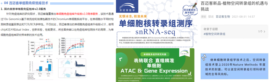 百邁客是國(guó)內(nèi)首批引進(jìn)10x genomics單細(xì)胞測(cè)序平臺(tái),在國(guó)內(nèi)展開(kāi)高通量單細(xì)胞測(cè)序服務(wù)。目前累計(jì)成功制備200余種組織類型、5000+例的樣本,覆蓋的物種和樣品類型包括人和小鼠的腦組織、肺臟、皮膚、視網(wǎng)膜、腎臟、脾臟、小腸,以及斑馬魚、擬南芥、水稻等。為了幫助更多老師開(kāi)展單細(xì)胞空間多組學(xué)研究領(lǐng)域,資深單細(xì)胞技術(shù)團(tuán)隊(duì)在百邁客醫(yī)學(xué)微信公眾號(hào)創(chuàng)辦了百邁客單細(xì)胞 & 空間轉(zhuǎn)錄組專題欄目系列,可提供專業(yè)的課題方案設(shè)計(jì)、案例分享、數(shù)據(jù)分析和時(shí)空多維解決方案,同時(shí)含有發(fā)文思路、分析技巧、項(xiàng)目經(jīng)驗(yàn)等應(yīng)有盡有,百邁客人在過(guò)去的一年只為給您專業(yè)優(yōu)質(zhì)的單細(xì)胞&空間轉(zhuǎn)錄組系列服務(wù)!