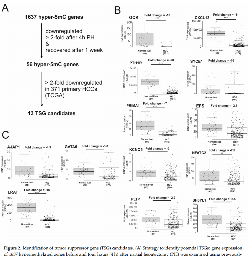 在肝再生過程中,增殖基因被激活,而抗增殖基因被抑制,從而使靜止的肝細(xì)胞重新進(jìn)入細(xì)胞周期。本研究選取小鼠三分之二肝部分切除術(shù) (PH) 之前和之后四小時(shí)檢測(cè)高甲基化基因的表達(dá)水平,挑選標(biāo)準(zhǔn)是與對(duì)照假手術(shù)(SH)相比表達(dá)量下調(diào)超過兩倍的基因,以及這些基因應(yīng)該在部分肝切除術(shù)后一周內(nèi)恢復(fù)表達(dá)量(圖2A)?;谶@些標(biāo)準(zhǔn),選取了56個(gè)基因。之后在TCGA的 371 個(gè)人類原發(fā)性 HCC和50個(gè)正常肝臟的RNA-seq數(shù)據(jù)中比較這些基因的表達(dá),發(fā)現(xiàn)13 個(gè)在 HCC 中下調(diào)超過兩倍(圖2BC),其中有3個(gè)基因已知是腫瘤抑制基因(圖 2C) ,分別是粘附連接相關(guān)蛋白 1 (AJAP1)、GATA 結(jié)合蛋白 5 (GATA5) 和卵磷脂視黃醇?;D(zhuǎn)移酶 (LRAT) 。此外,其余10個(gè)潛在的抑癌基因具有不同的功能,包括轉(zhuǎn)錄調(diào)控 (NFATC2)、細(xì)胞遷移 (EFS和CXCL12)、葡萄糖代謝 (GCK) 和細(xì)胞生長(zhǎng) (PTH1R 和 SH3YL1)。