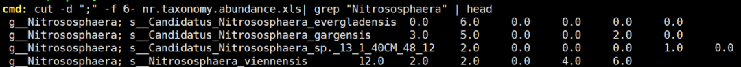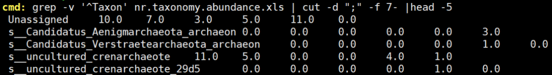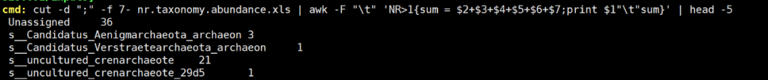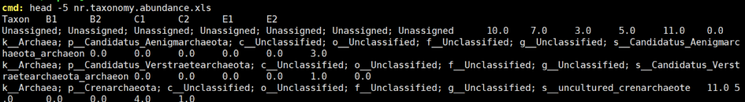 在實際運用過程中,我們通常根據需要,通過管道符“|”同時使用好幾種生物信息學Linux命令,避免花費大量時間找軟件、寫代碼,有些情況下可以代替Excel等辦公軟件。如下就是一些linux命令的高級使用實例。如下是一個宏基因組的NR注釋結果示例文件: