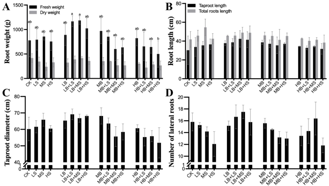 在收獲時,還確定了地塊產(chǎn)量的變化(圖2)。與兩個明顯的倒V形趨勢的生長結(jié)果一致,LB + LS和LB + MS處理下的R. palmatum?L.根的鮮重得到了最顯著的改善(圖2A)。我們進一步分析了主根和側(cè)根的變化(圖2B-D),發(fā)現(xiàn)在LB+MS下獲得最大的根長和側(cè)根數(shù),而在LB+LS下獲得最大的主根直徑,這意味著 LB + MS處理刺激側(cè)根的數(shù)量和長度,而LB + LS促進主根厚度以提高R. palmatum?L.的根重。