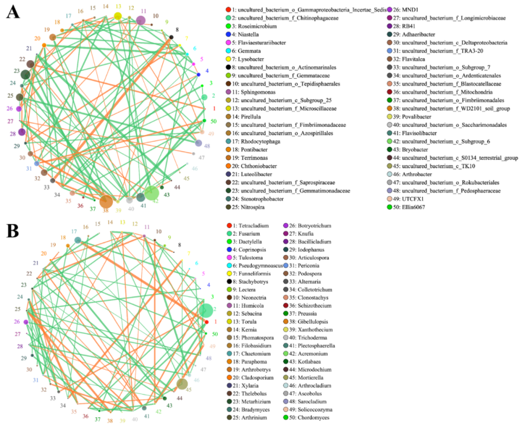 圖9 基于相關(guān)性的細(xì)菌(A)和真菌(B)群落網(wǎng)絡(luò)分析