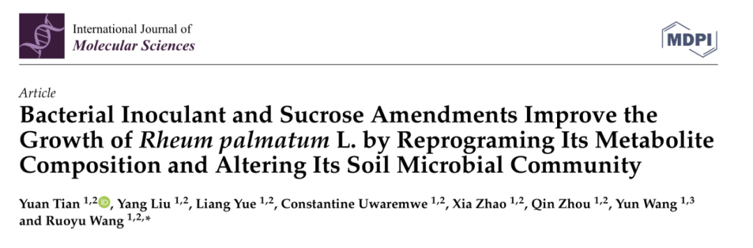 2022年2月,中國科學(xué)院西北生態(tài)環(huán)境與資源研究所在《International Journal of Molecular Science》發(fā)表題為“Bacterial Inoculant and Sucrose Amendments Improve the Growth of?Rheum palmatum?L. by Reprograming Its Metabolite Composition and Altering Its Soil Microbial Community”的研究論文,該論文主要研究了(1)細(xì)菌接種劑和蔗糖聯(lián)合使用對R. palmatum?L.的影響;(2)聯(lián)合接種對土壤性質(zhì)和土壤微生物的影響;(3)聯(lián)合接種后根際微生物變化及其與R. palmatum?L.生長變化的關(guān)聯(lián)。