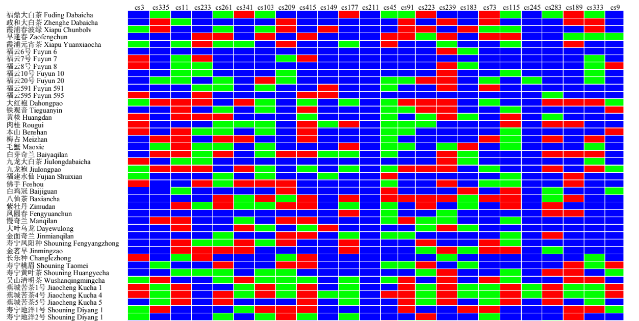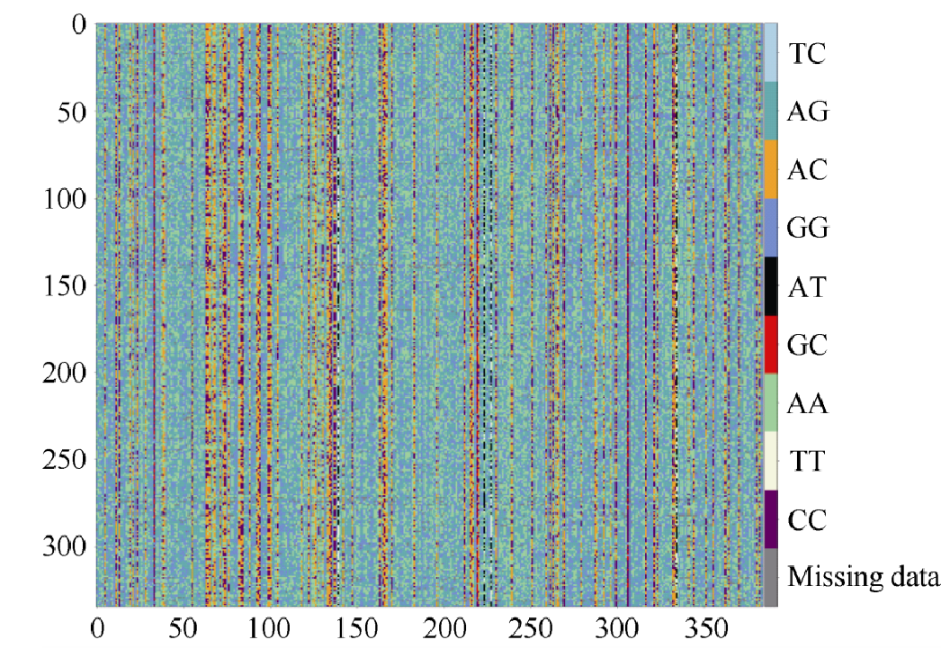 篩選適宜的核心標記位點,并將其用合適的形式展現(xiàn)出來至關(guān)重要。利用篩選得到的SNP標記進行品種材料的鑒定,并構(gòu)建DNA指紋圖譜。例如,玉米DNA指紋圖譜構(gòu)建研究中,利用384個?SNP?標記組合構(gòu)建了?335?個玉米雜交種的基因型指紋圖譜,?該圖顯示每個品種的基因型組合均不同,?即?384?個?SNP?位點能夠有效區(qū)分所測試的雜交種。