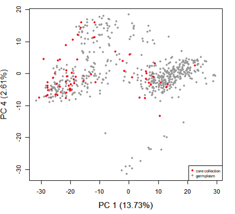 核心種質(zhì)資源(core?collection),即保存的種質(zhì)資源的一個核心子集,是采用一定方法,從保存的某一物種種質(zhì)資源中抽取的一個核心子集,以最少的遺傳資源樣本量最大限度地代表包括地理分布在內(nèi)的整個資源群體的遺傳多樣性,而未列入核心種質(zhì)的其它資源材料則作為保留樣本予以保存。因此核心種質(zhì)可以作為種質(zhì)資源群體研究和利用的切入點(diǎn),從而提高整個種質(zhì)庫的管理和利用水平。