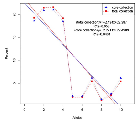構(gòu)建好的核心種質(zhì)采用何種方法去評估核心樣品對整個種質(zhì)資源多樣性的代表性同樣是核心種質(zhì)研究中的重點(diǎn)。目前,大多數(shù)研究者結(jié)合不同的方法對核心種質(zhì)進(jìn)行評估驗(yàn)證,通過對原始種質(zhì)材料和篩選的核心種質(zhì)材料進(jìn)行主成分分析,評估種質(zhì)篩選的準(zhǔn)確性,原則上,基于核心種質(zhì)繪制的主成分圖和所有材料的分布圖趨勢吻合,就能說明篩選結(jié)果的合理性;計(jì)算常規(guī)的遺傳多樣性指標(biāo):觀測雜合度(Observed?heterozygosity)、期望雜合度(Expected?heterozygosity)、Nei遺傳多樣性(Nei?diversity?index)、香濃維納多樣性指數(shù)(Shanon-Wiener?index)、多態(tài)性信息含量(PIC),對原始種質(zhì)材料以及篩選的核心種質(zhì)的遺傳多樣性進(jìn)行評價;另外還包括等位基因評價和表型評價。