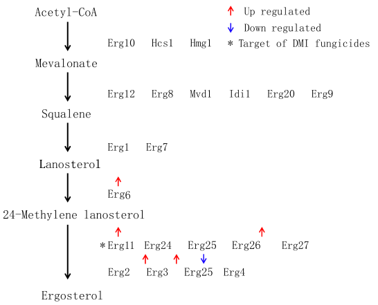 在真菌中,麥角甾醇是由乙酰輔酶A(乙酰輔酶A)通過復(fù)雜途徑合成的。釀酒酵母中的麥角甾醇生物合成步驟研究較為透徹,共有21個基因參與麥角甾醇生物合成。我們從C. fructicola中找到了相關(guān)同源基因。在苯醚甲環(huán)唑脅迫下,在參與麥角甾醇生物合成的基因中,與對照相比, Erg11(DMI殺菌劑的靶標(biāo),在真菌中被稱為CYP51)基因被發(fā)現(xiàn)上調(diào)。Erg6、Erg27、Erg3和Erg5基因表達(dá)量也上調(diào)。與對照組相比,Erg4基因受到抑制。苯醚甲環(huán)唑處理后,其他15個基因的表達(dá)水平?jīng)]有顯著變化。說明:DMI類殺菌劑對炭疽菌產(chǎn)孢的促進(jìn)作用可能與麥角甾醇合成途徑中基因表達(dá)量的變化及甾醇種類變化有關(guān)。