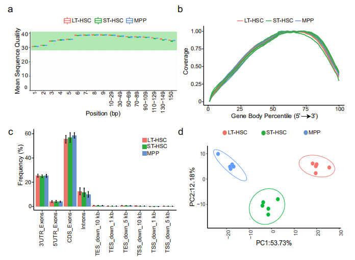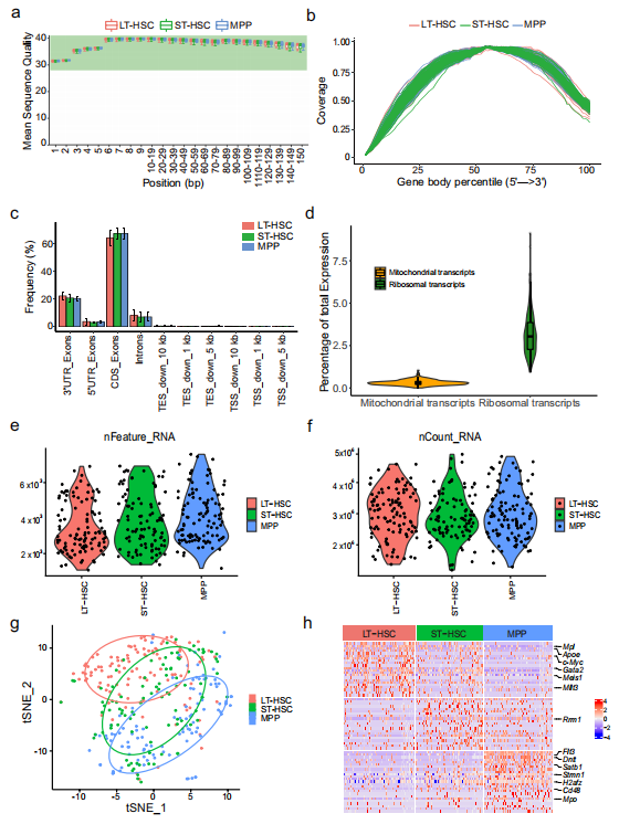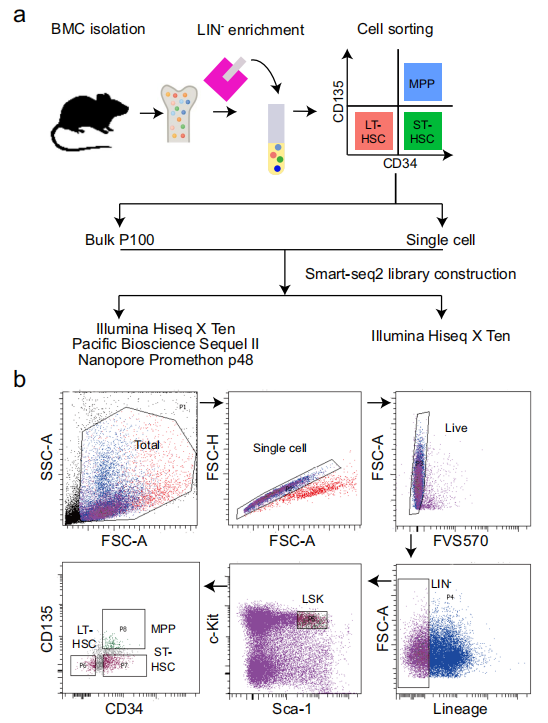 樣本制備:8-9周的雌性成年C57BL/6 J 小鼠,從股骨和脛骨中分離骨髓細胞。首先使用小鼠造血干細胞分離試劑盒富集造血干細胞和祖細胞(HSPC)。長期(LT)和短期(ST)造血干細胞(HSC)和多能祖細胞(MPP)根據(jù)其表面標志物進行分選。對于單細胞RNA測序(scRNA-seq),將細胞單獨分選到含有裂解緩沖液的8條PCR管中。同時對于批量RNA-seq,分選100個細胞(P100)到一個PCR管中作為生物學(xué)重復(fù)。