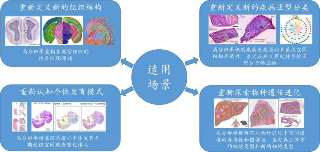 高分辨率價(jià)值在于可在微小組織、腫瘤組織、細(xì)胞類(lèi)型亞型分析、識(shí)別未知細(xì)胞等方面發(fā)揮得天獨(dú)厚的優(yōu)勢(shì),百創(chuàng)S1000 亞細(xì)胞分辨率可以適用不同個(gè)體、組織、發(fā)育時(shí)期,適用現(xiàn)階段任何組織空間分析信息的獲取,正式開(kāi)啟間轉(zhuǎn)錄組測(cè)序亞細(xì)胞時(shí)代。