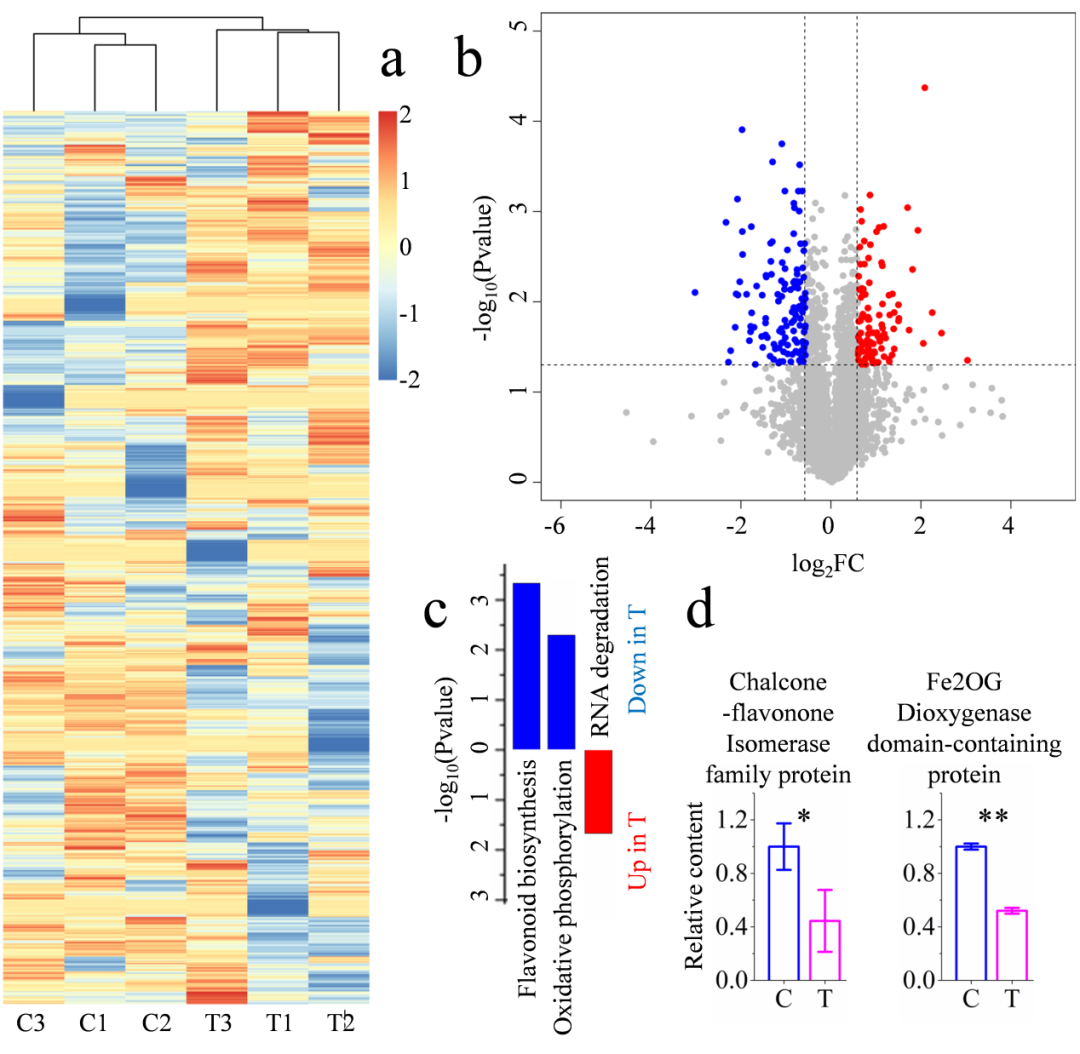 與對照組相比,在四環(huán)素處理下有273種蛋白質發(fā)生了顯著變化(P<?0.05)。KEGG富集分析發(fā)現(xiàn),這些差異蛋白與類黃酮生物合成、氧化磷酸化、RNA降解、植物晝夜節(jié)律和α?-亞麻酸代謝相關。最顯著的是,在四環(huán)素脅迫下,與RNA降解相關的蛋白顯著增加(P?<?0.05,增加80%以上)。黃酮類化合物的生物合成和氧化磷酸化顯著減少(P?<?0.05,下降80%以上)。與轉錄組結果一致,黃酮類化合物的生物合成通路也是顯著降低。