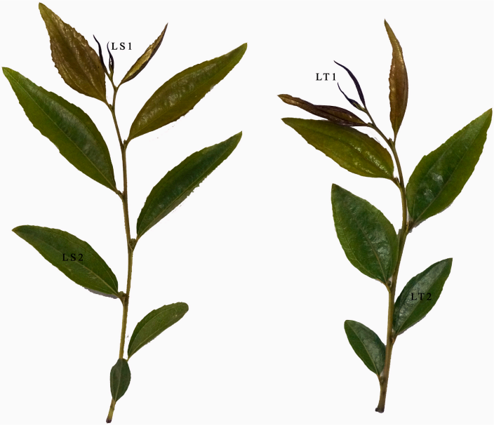 實(shí)驗(yàn)材料:本研究使用了兩個(gè)紫葉棗品種和八個(gè)綠葉棗品種。轉(zhuǎn)錄組和代謝組材料:兩個(gè)紫葉棗品種,“Sanbianhong”和“Tailihong”,?葉芽分別命名為L(zhǎng)S1和LT1,成熟葉分別命名為L(zhǎng)S2和LT2(圖1)