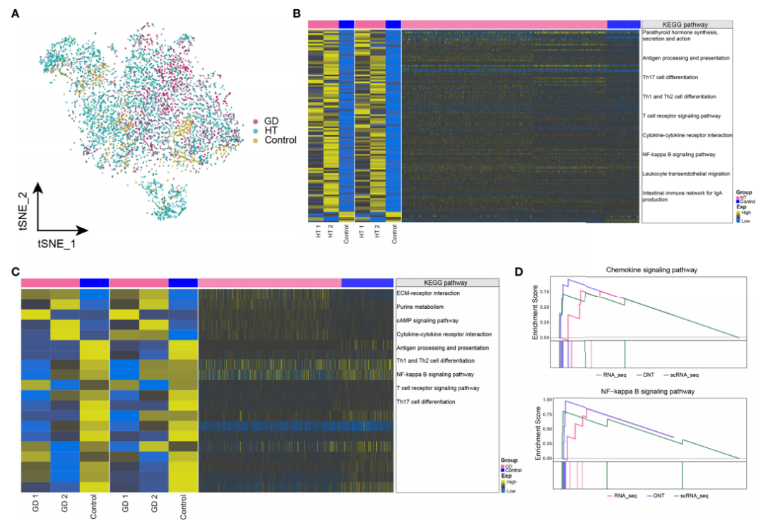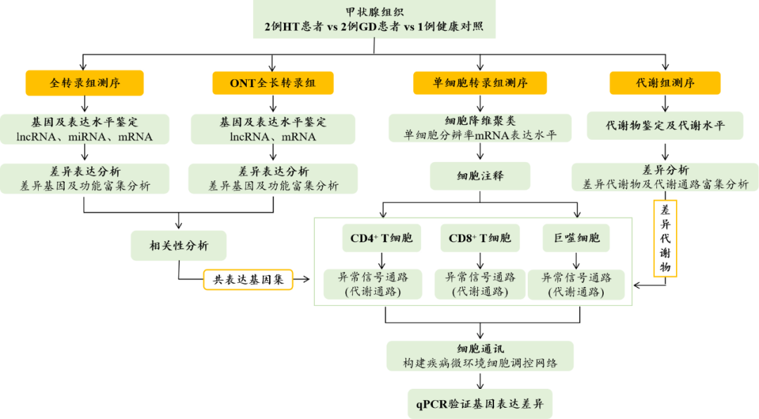 本研究基于HT患者、GD患者和健康對照甲狀腺組織的單細胞RNA測序、全轉錄組測序、ONT全長轉錄組測序和代謝組測序數(shù)據(jù),探討了HT和GD疾病微環(huán)境中基因表達失調和代謝信號異常的免疫細胞,構建了免疫細胞的全局調節(jié)網絡,為進一步了解HT和GD免疫紊亂和代謝異常介導的疾病機制、更好地干預和治療疾病提供了科學的理論指導和研究基礎。
