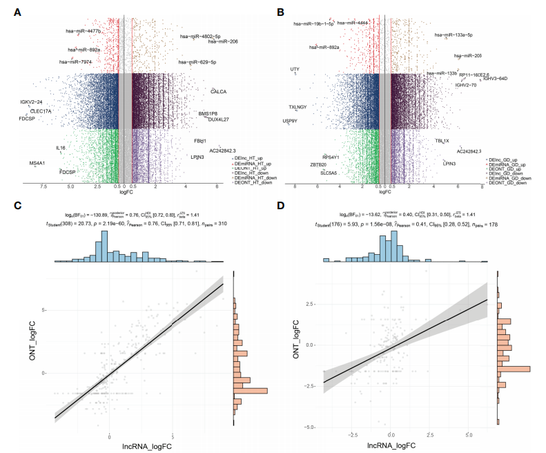 為了鑒定HT組和GD組中異常表達的lncRNA和miRNA,分別進行了ONT全長轉錄組測序和全轉錄組測序數(shù)據(jù)。差異表達分析結果顯示,共檢測到6,153?個?lncRNA?s和?741?個?miRNAs?在?HT?患者中存在差異表達(圖?1A);GD患者中檢測到5,492個lncRNAs?和?165?個?miRNAs?存在差異表達(圖?1B);相關性分析結果驗證了本研究中兩種測序方法的檢測穩(wěn)定性(圖?1C,?D)。