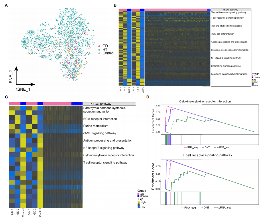對單細胞轉錄組數(shù)據(jù)中的CD4+?T細胞亞群進行進一步分析,發(fā)現(xiàn)在HT、GD和對照組中細胞豐度存在明顯差異(圖?3A)。將bulk?RNA-seq數(shù)據(jù)中顯著差異表達的基因,與CD4+??T細胞的單細胞RNA-seq數(shù)據(jù)中的基因取交集,并對這些共表達的基因集進行功能富集分析;分析結果顯示,HT組中顯著差異富集的通路有甲狀腺激素信號通路、T?細胞受體信號通路、Th1和Th2細胞分化、Th17細胞分化、細胞因子-細胞因子受體相互作用和NF-kappa?B信號通路(圖?3B);而在GD組中,甲狀旁腺激素合成,分泌和作用、ECM-受體相互作用、嘌呤代謝、cAMP?信號通路、NF-kappa?B?信號通路、細胞因子-細胞因子受體相互作用和T細胞受體信號通路顯著富集(圖?3C?)。GSEA富集分析結果顯示,HT組中細胞因子-細胞因子受體相互作用和T細胞受體信號通路顯著富集(圖?3D),但GD組中未觀察到顯著富集的通路。此外,氨基酸生物合成和嘌呤代謝相關的代謝通路在HT和GD組中均顯著富集。