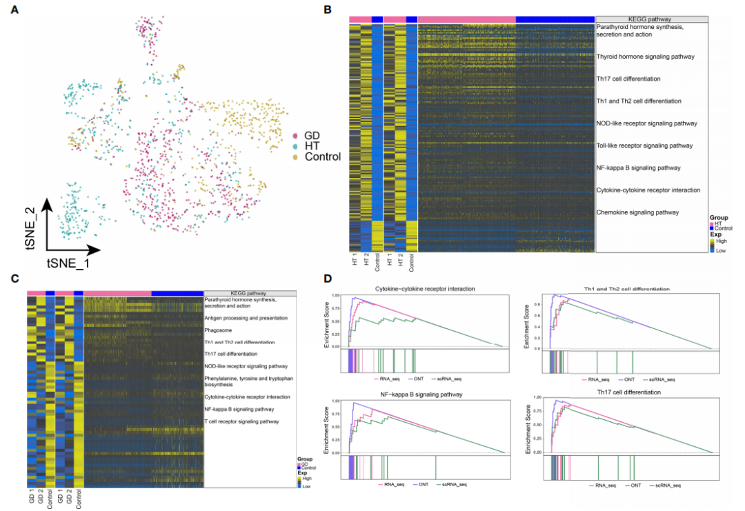 人類自身免疫性甲狀腺疾病?(AITD)?是最常見的器官特異性自身免疫性疾病,也是甲狀腺功能障礙和非地方性甲狀腺腫的最常見原因,主要表現(xiàn)為彌漫性甲狀腺腫(Graves’disease,GD)和橋本甲狀腺炎(Hashimoto’s?thyroiditis,HT);HT和GD具有不同的臨床特征,但它們在組織損傷方面是相似的,包括體內淋巴細胞浸潤。研究表明,T淋巴細胞及其特異性細胞因子作為免疫不可或缺的組成部分,在AITD的發(fā)生中起關鍵作用,例如調節(jié)性T細胞(Tregs)和輔助T細胞17?(Th17)的失調、Th1/Th2失衡在AITD的發(fā)病機制中起著關鍵作用,但這些細胞亞群免疫功能障礙引起的致病分子機制在很大程度上仍未得到解釋。