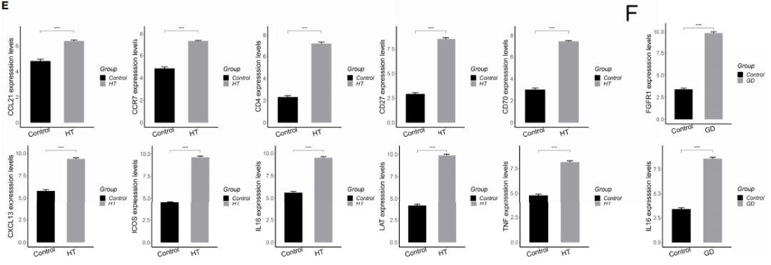 鑒于免疫反應在HT和GD中的重要作用,利用GSEA方法進行免疫浸潤分析,進一步評估了樣本中免疫細胞的豐度,發(fā)現(xiàn)CD4?+T細胞、CD8?+?T細胞、巨噬細胞、Th1和Th2細胞均有不同程度的浸潤(圖?2H)。