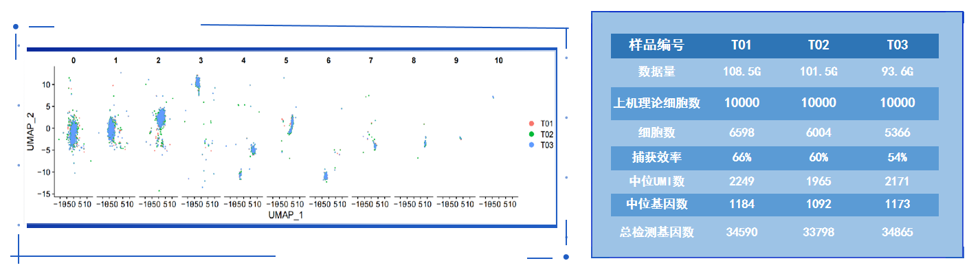 PBMC重復(fù)性檢測:將相同的PBMC細(xì)胞懸液分3份,通過3個不同實(shí)驗(yàn)人員,用3臺百創(chuàng)DG1000儀器,獨(dú)立進(jìn)行單細(xì)胞測序,得到了幾乎一致的細(xì)胞聚類分群結(jié)果,證明百創(chuàng)DG1000具有很好的可重復(fù)性及穩(wěn)定性(圖5)。