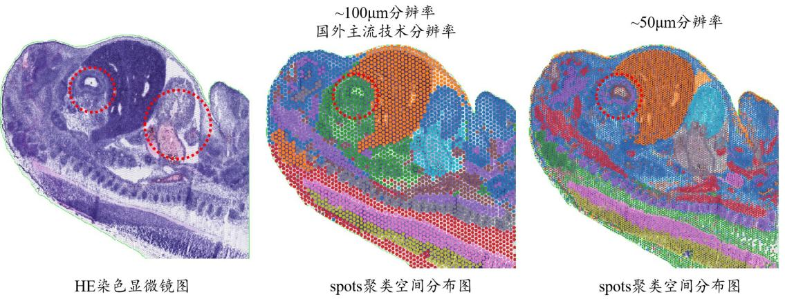 大鼠胚胎亞細(xì)胞分辨率實(shí)測數(shù)據(jù)展示:與100μm分辨率(主流技術(shù)平臺)對比,高分辨率(~50μm)下HE染色組織形態(tài)學(xué)與spots聚類空間分布圖重合度更高,精準(zhǔn)識別空間基因表達(dá)的異質(zhì)性和組織區(qū)域的特異性(圖7)。