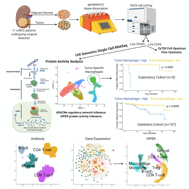 研究內(nèi)容:腎透明細(xì)胞癌(CCRCC)是一種異質(zhì)性疾病術(shù)后病程可變。為了建立一個全面的CCRCC腫瘤免疫微環(huán)境(TME)圖譜,對未經(jīng)治療的CCRCC切除的腫瘤和腫瘤鄰近組織的造血和非造血亞群進(jìn)行scRNA-seq。利用VIPER算法進(jìn)行單細(xì)胞蛋白活性定量,并通過與流式細(xì)胞術(shù)的比較來驗證該方法。該分析鑒定了關(guān)鍵的TME亞群以及它們主要的調(diào)控因子和候選細(xì)胞-細(xì)胞相互作用,揭示了基因表達(dá)分析無法檢測的臨床相關(guān)人群。本文發(fā)現(xiàn)一個特征為TREM2/APOE/C1Q上調(diào)的特異巨噬細(xì)胞亞群,并通過空間分辨、定量多光譜免疫熒光驗證。在一個大型臨床驗證隊列中,這些標(biāo)志物在術(shù)后復(fù)發(fā)患者的腫瘤中顯著富集。因此,該研究確定了TREM2/APOE/C1Q陽性巨噬細(xì)胞浸潤作為CCRCC復(fù)發(fā)的潛在預(yù)后生物標(biāo)志物以及一個候選治療靶點。