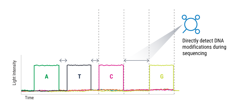 PacBio平臺主要通過DNA聚合酶與模板鏈結(jié)合,在鏈合成的過程中,不同熒光標(biāo)記的堿基會釋放不同的熒光信號,根據(jù)光的波長與峰值從而判斷堿基類型與順序。聚合酶合成中每個堿基間都存在時間間隔,當(dāng)模板堿基有修飾時,兩個相鄰的脈沖峰之間的距離就會延長。當(dāng)IPD比例(兩個相鄰的脈沖峰之間的距離和參考序列距離的比值)明顯大于1 時,可推斷這個位置存在修飾。