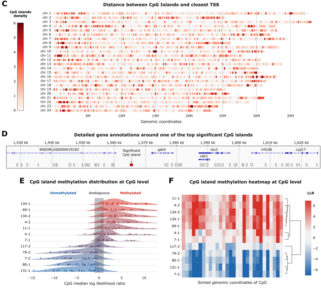 • E面板D中突出顯示的CpG島的CpG水平對數(shù)似然比核密度圖。通過降低中值llr,在Y軸上對樣本進行排序。單個CpG值由點表示。