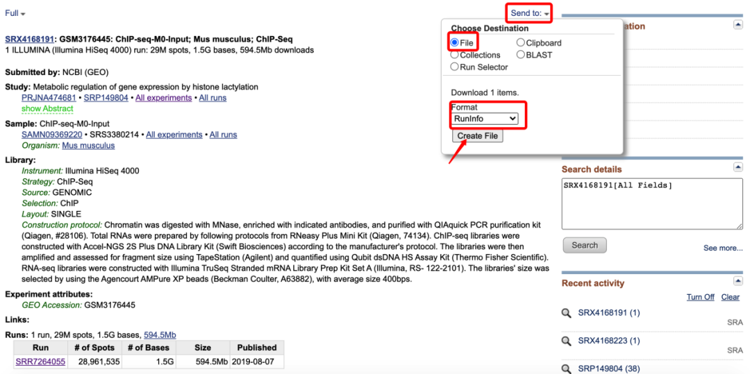 然后點擊最下方SRA編號,進入下面的頁面這里面包含了這個樣本的基本信息,包括測序平臺、文庫類型、數(shù)據(jù)量等基本信息,然后點擊頁面右上方的Send to按鈕,選擇File,F(xiàn)ormat選擇RunInfo,然后點擊Creat file下載一個csv文件,打開文件,可以看到一個下載鏈接