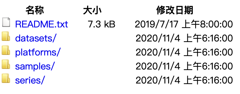 d)?GEO Dataset (GDS) 數(shù)據(jù)集的ID號這些數(shù)據(jù)均可以在ftp(ftp://ftp-trace.ncbi.nih.gov/geo/)進行下載。一般我們在文章中看到的都是GSE的ID,那我們?nèi)绾瓮ㄟ^GSE的ID進行數(shù)據(jù)的下載呢,下面就讓小編手把手教您如何進行GEO數(shù)據(jù)的下載。