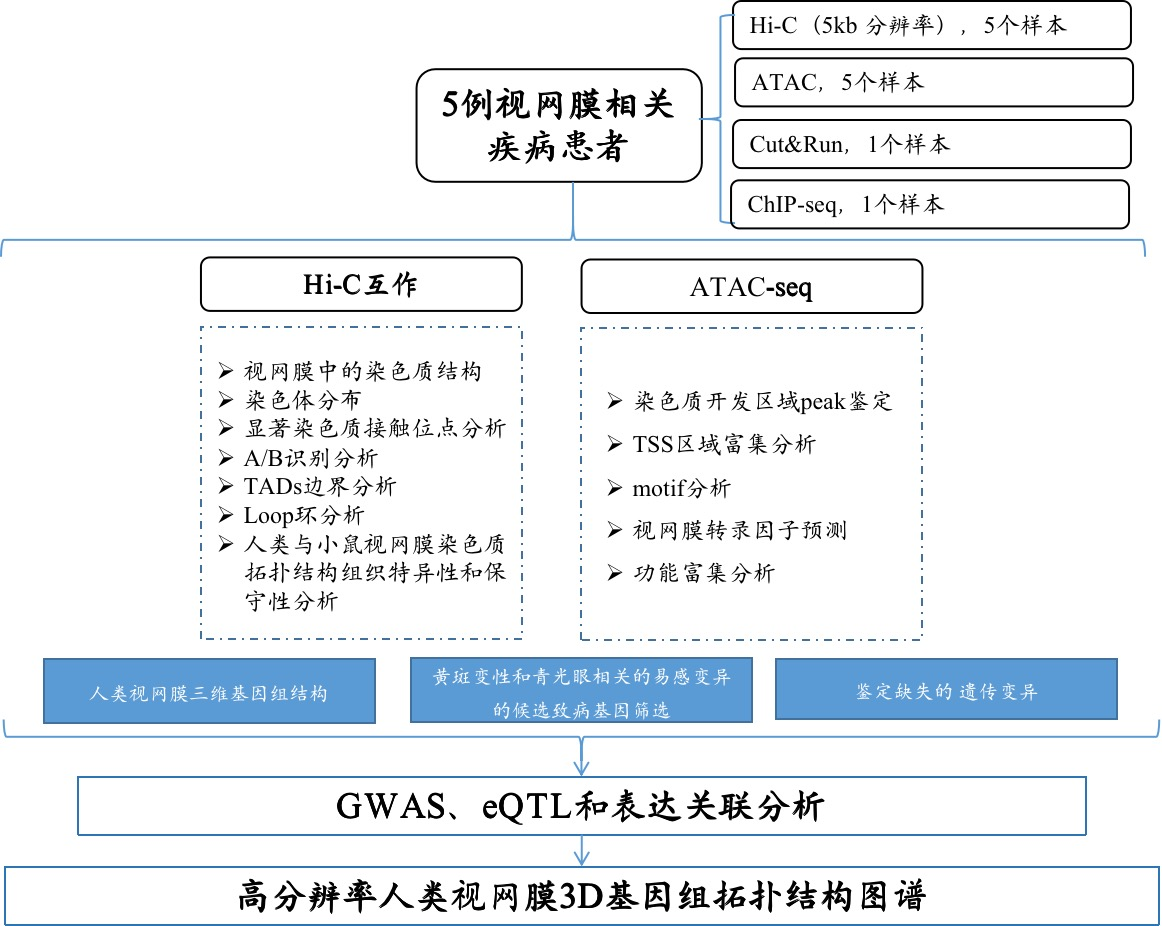 在過(guò)去視網(wǎng)膜疾病的全基因組關(guān)聯(lián)研究(GWAS)發(fā)現(xiàn)常見(jiàn)的變異主要在基因組非編碼區(qū)域,但由于先導(dǎo)變異區(qū)域的局部連鎖不平衡(LD),阻礙了特定關(guān)聯(lián)基因和變異的識(shí)別,因此闡明與性狀相關(guān)的遺傳變異如何影響調(diào)節(jié)基因表達(dá)網(wǎng)絡(luò),并因此影響表型,亟需了解相關(guān)組織和細(xì)胞類型的3D基因組拓?fù)浣Y(jié)構(gòu)。