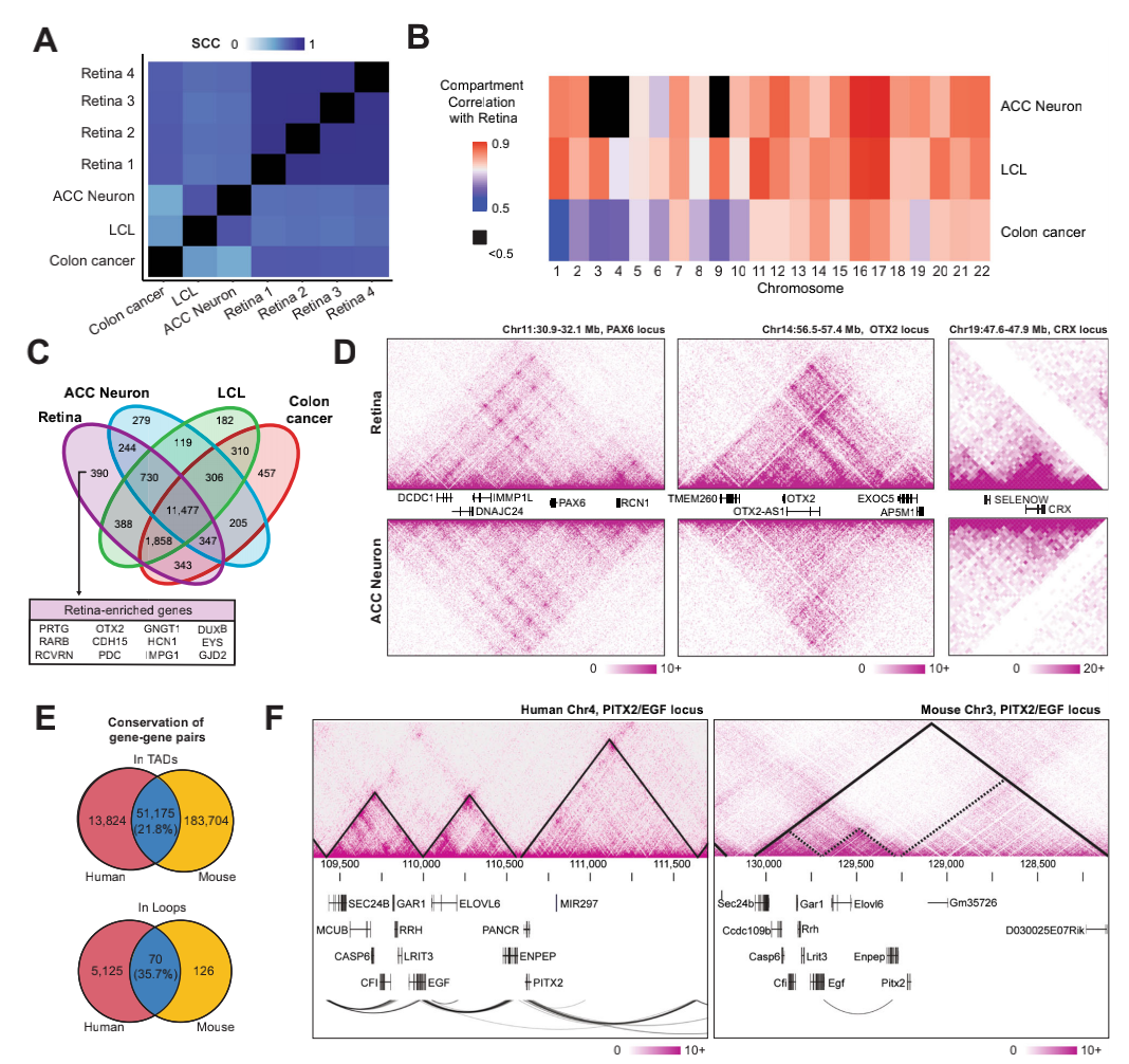 為了評(píng)估已識(shí)別的染色質(zhì)特征在人視網(wǎng)膜組織特異性和物種保守性,這里比較了人類神經(jīng)元(ACC)、GM12878淋巴細(xì)胞(LCL)、結(jié)腸癌細(xì)胞(HCT116,clone cancer)Hi-C測(cè)序數(shù)據(jù),發(fā)現(xiàn)視網(wǎng)膜特異性基因,如OTX2、EYS、PDC,只存在于視網(wǎng)膜的A component;由于視網(wǎng)膜和ACC神經(jīng)元之間的高度相關(guān)性,比較發(fā)現(xiàn)PAX6基因座在神經(jīng)元和視網(wǎng)膜中的相互作用與其在兩個(gè)組織中的表達(dá)相似,而編碼OTX2和CRX兩個(gè)關(guān)鍵的視網(wǎng)膜TF,在視網(wǎng)膜中表現(xiàn)出大量的局部相互作用,但在神經(jīng)元中沒(méi)有,表明人視網(wǎng)膜組織拓?fù)潢P(guān)聯(lián)域具有組織特異性,并在基因調(diào)節(jié)中發(fā)揮著重要作用。