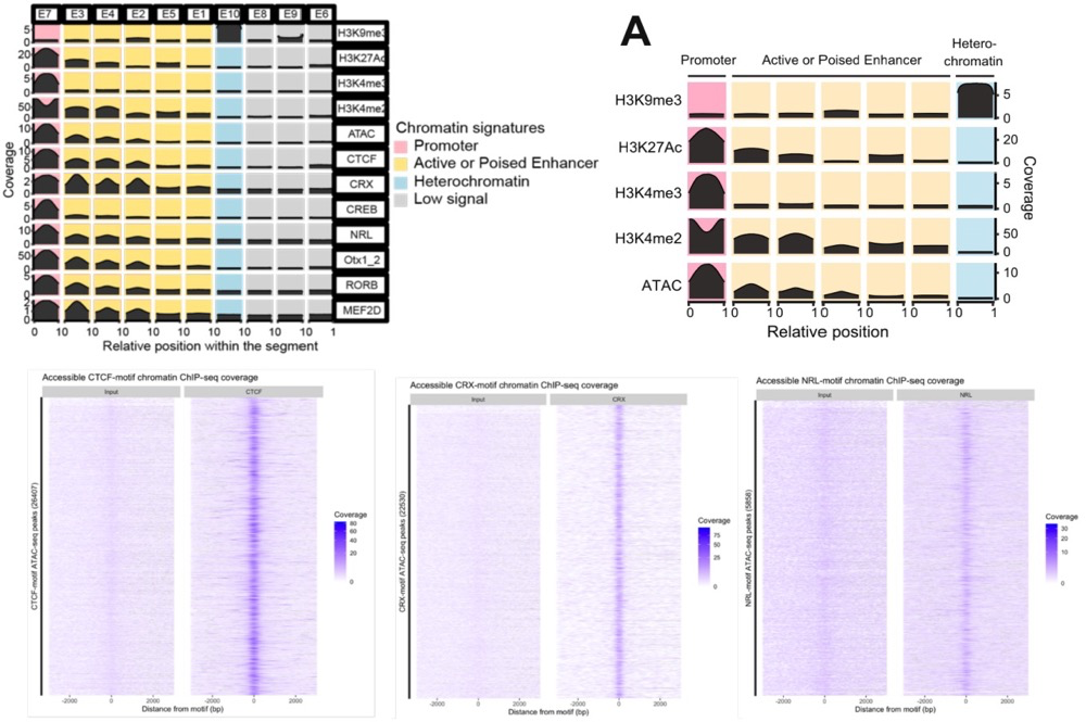 染色質(zhì)互作形成的loops促進(jìn)CRE與其目標(biāo)基因之間的物理相互作用,并且在控制基因表達(dá)方面發(fā)揮著至關(guān)重要的作用。為了識(shí)別視網(wǎng)膜CRE,利用染色質(zhì)可及性檢測(cè)(ATAC-seq)確定了染色質(zhì)開(kāi)放狀態(tài)和CUT&Run檢測(cè)活性(H3K4me3,H3K27Ac,H3K4me234)和抑制性(H3K9me3)組蛋白標(biāo)記互作的特征序列。通過(guò)全基因組染色質(zhì)開(kāi)放程度以及開(kāi)放區(qū)域(啟動(dòng)子、增強(qiáng)子、異染色質(zhì)、低豐度信號(hào))構(gòu)建了10種染色質(zhì)狀態(tài)模型,啟動(dòng)子和增強(qiáng)子區(qū)域富集了用于結(jié)合CTCF和關(guān)鍵視網(wǎng)膜TF,如CRX、NRL、OTX2、MEF2D、CREB和RORB,另外增強(qiáng)子主要在TSS上游區(qū)域富集,而啟動(dòng)子僅在TSS富集。