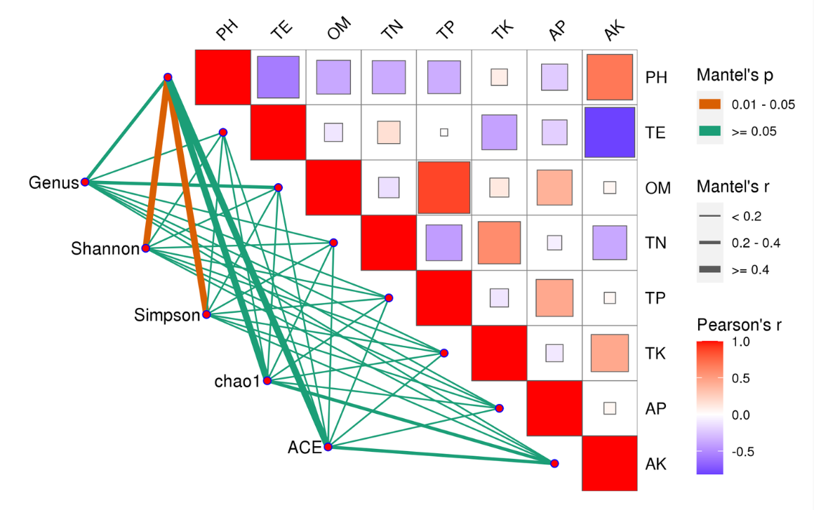 Mantel Test分析:Mantel test 是檢驗(yàn)兩個(gè)矩陣相關(guān)關(guān)系的非參數(shù)統(tǒng)計(jì)方法,多用在生態(tài)學(xué)上,用來(lái)檢驗(yàn)群落距離矩陣(如 Bray-Curtis distance matrix)和環(huán)境變量距離矩陣(即環(huán)境因子指標(biāo))之間的相關(guān)性。其可以得到特征與環(huán)境因子之間的mantel test的r值和p值。