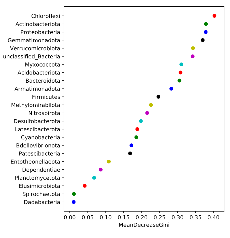 隨機(jī)森林分析:Random forest 分析,隨機(jī)森林指的是利用多棵樹(shù)對(duì)樣本進(jìn)行訓(xùn)練并預(yù)測(cè)的一種分類(lèi)器,是機(jī)器學(xué)習(xí)的一種。利用隨機(jī)森林分析可以幫我們找到數(shù)據(jù)中重要的特征:在微生物組中就是哪些微生物組成可以作為特征進(jìn)行各種預(yù)測(cè);另外,隨機(jī)森林可以利用這些重要特征構(gòu)建模型用于分類(lèi)預(yù)測(cè)(分類(lèi)變量)或者回歸預(yù)測(cè)(數(shù)值型變量);隨機(jī)森林分析建議分組內(nèi)樣品至少30個(gè)以上,樣品數(shù)太少影響準(zhǔn)確性。 隨機(jī)森林分析,一般將數(shù)據(jù)劃分為訓(xùn)練數(shù)據(jù)集(train data)和測(cè)試數(shù)據(jù)集(test or validate data),訓(xùn)練數(shù)據(jù)集用于構(gòu)建預(yù)測(cè)模型,測(cè)試集用于查看模型的準(zhǔn)確性。