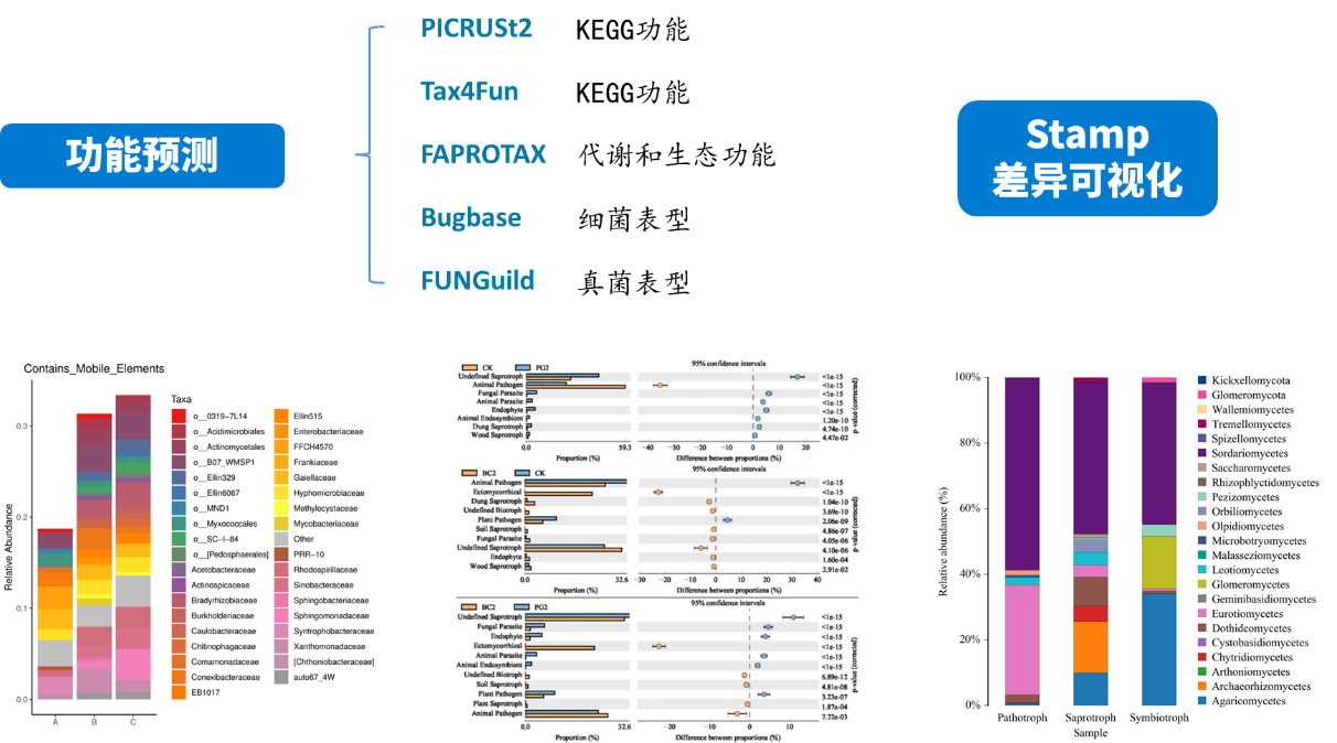 PICRUSt 2 將特征序列(16S rRNA)與微生物基因組數(shù)據(jù)庫(kù)(IMG,Integrated Microbial Genomes)參考序列對(duì)齊(aliign)構(gòu)建進(jìn)化樹(shù),找到特征序列的“最近物種”,并根據(jù)已知物種的基因種類(lèi)和豐度信息預(yù)測(cè)未知物種的基因信息,從而結(jié)合基因的KEGG通路信息預(yù)測(cè)整個(gè)群落的通路情況。通過(guò)組間差異分析,得到在組間具有顯著差異的功能,最后利用Stamp對(duì)結(jié)果進(jìn)行差異可視化。