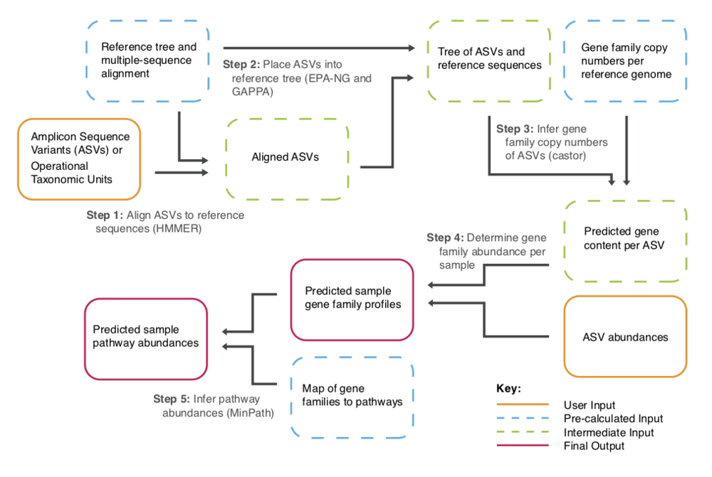 PICRUSt2 (Phylogenetic Investigation of Communities by Reconstruction of Unobserved States)是一款基于樣本中的標(biāo)記基因序列豐度來(lái)預(yù)測(cè)樣本功能豐度的軟件。這里的功能是指基因家族,如KEGG同源基因、EC酶分類(lèi)號(hào)等,其原理如下圖: