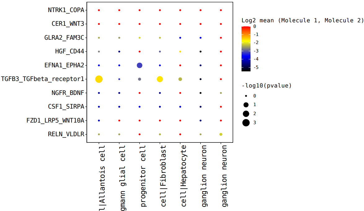 注:橫坐標(biāo)是細(xì)胞類型互作,縱坐標(biāo)是蛋白互作,點(diǎn)越大表示 p 值越小,顏色代表平均表達(dá)量