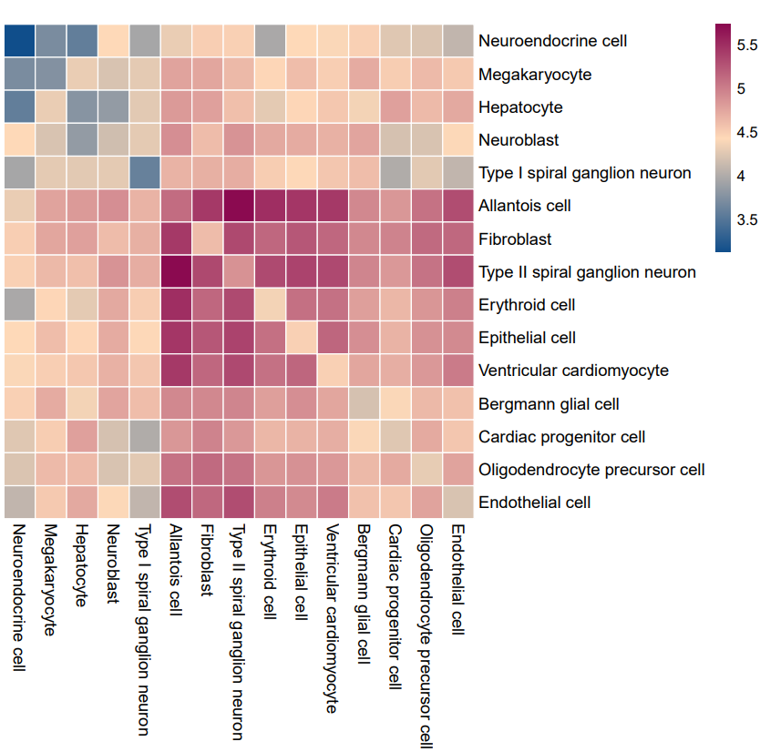 注:橫縱坐標(biāo)表示細(xì)胞類型,顏色深藍(lán)色到紫紅色代表互作數(shù)由低到高