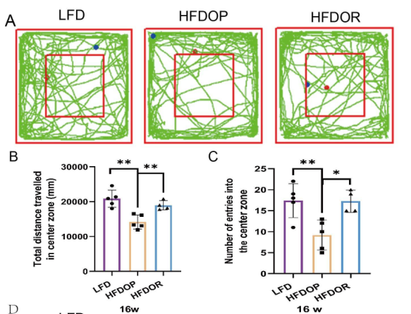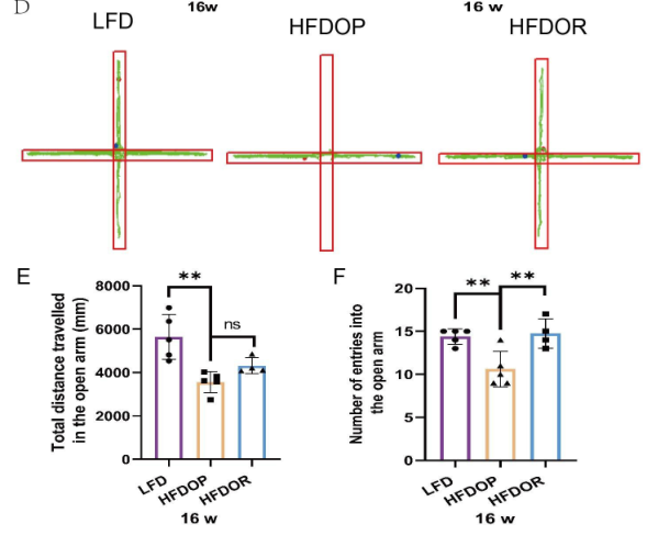 為了排除抑郁和焦慮樣行為對肥胖抵抗的影響,在16周結(jié)束時進行了自發(fā)開場活動實驗和高架十字迷宮實驗。開場實驗結(jié)果如圖2A-C所示。HFDOP組進入中心區(qū)域的次數(shù)和進入該區(qū)域的次數(shù)顯著低于LFD組(圖2B、C)。HFDOR 組比 HFDOP 組更遠地進入中心區(qū)域并且更頻繁地進入該區(qū)域(圖2B、C)。高架十字迷宮實驗表明,與LFD組相比,HFDOP組進入開臂的次數(shù)和頻率都要少得多(圖3E、F)。HFDOR組比HFDOP組開臂走得更遠,但兩組之間沒有統(tǒng)計學意義。HFDOR組比HFDOP組更頻繁地進入開臂(圖3F)。