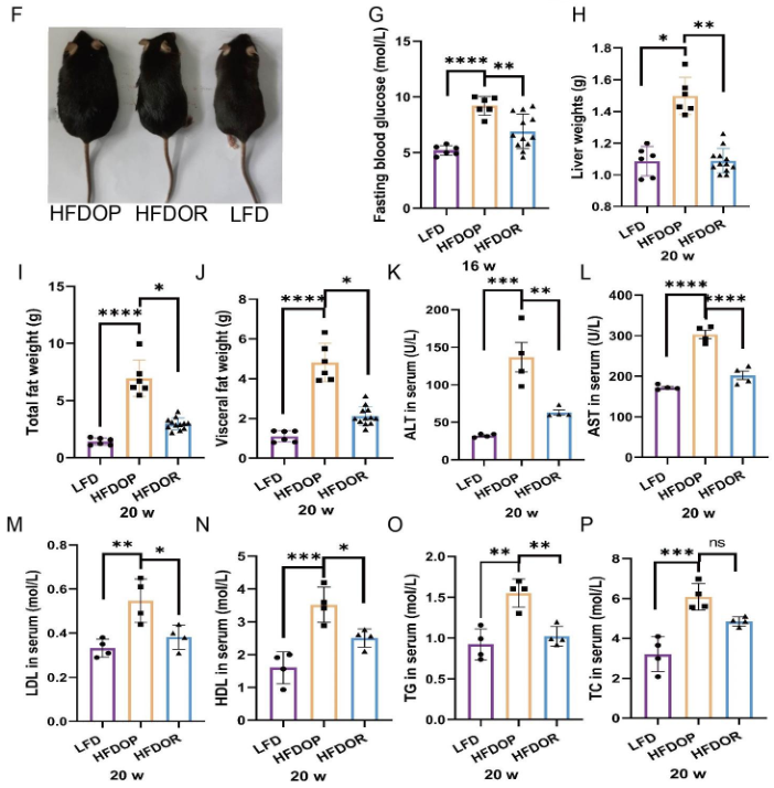 然而,HFDOR組的肝臟、總脂肪和總內(nèi)臟脂肪的重量顯著低于HFDOP組(圖1H-J)。HFDOP組AST、ALT、HDL、LDL、TG和TC水平較LFD組顯著升高(圖3K-P)。然而,HFDOR組的AST、ALT、高密度脂蛋白、低密度脂蛋白和甘油三酯水平顯著低于HFDOP組(圖3K-O)。盡管HFDOR組的TC水平低于HFDOP組,但差異無統(tǒng)計學意義。