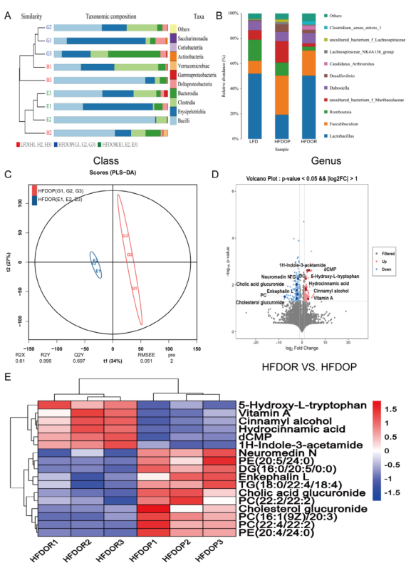 使用全長16S微生物多樣性測序和非靶向代謝組學方法檢測了小腸內(nèi)容物。HFDOP組的Muribaculaceae、Faecalibaculum、Desulfovibrio和 Lachnospiraceae的相對豐度高于 LFD 和 HFDOR 組,但差異無統(tǒng)計學意義。LFD對照組和HFDOR組Clostridium和Lactobacillus的相對豐度高于 HFDOP 組,但只有梭狀芽胞桿菌水平的差異具有統(tǒng)計學意義。
