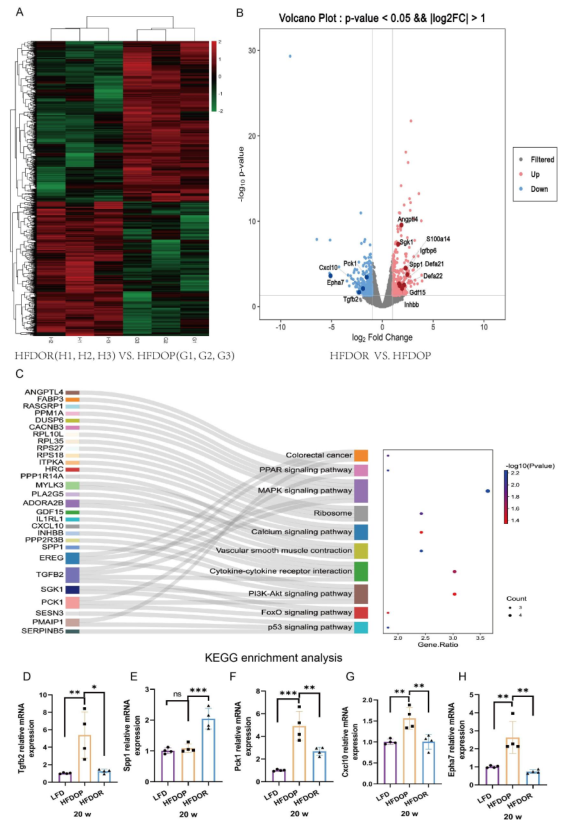 為了進一步探討肥胖/肥胖抵抗的原因,研究者運用全長轉(zhuǎn)錄組測序技術(shù)檢測空腸組織中的基因轉(zhuǎn)錄水平。共鑒定出1645個差異表達基因(750個上調(diào),895個下調(diào)),其中331個差異表達顯著。在331個顯著差異表達基因中中,有30個基因在11條KEGG通路中被富集。富集的基因和10條最豐富的KEGG途徑如圖所示,這些基因在絲裂原活化蛋白激酶(MAPK)、細胞因子和磷脂酰肌醇3’激酶/蛋白激酶B(PI3K/Akt)信號通路中顯著豐富(圖6C)。用qPCR分別驗證了差異表達基因。Tgfb2、Spp1、Pck 1、Cxcl10和Epha7表現(xiàn)出一致的mRNA表達模式(圖6B,D-H)。
