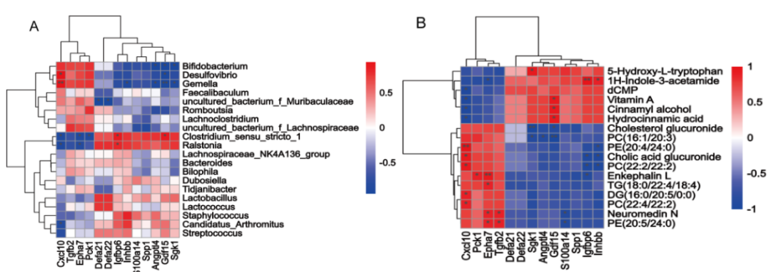 Clostridium_sensu_stricto_1 和 Ralstonia 與 Igfbp6 和 Gdf15 呈正相關(guān),與 Epha7、Pck1和Cxcl10 呈負相關(guān)。此外,Defa21和Defa22與uncultured_bacterium_f_Muribaculaceae呈負相關(guān)(圖7A)。DEGs與代謝物的相關(guān)分析結(jié)果表明,H-吲哚-3-乙酰胺與Igfbp6和Inhbb水平呈顯著正相關(guān),與Epha7呈負相關(guān)。代謝產(chǎn)物5-羥色胺與SGK1呈顯著正相關(guān)。維生素A、肉桂醇和氫肉桂酸與GDF15呈顯著正相關(guān),與CxCl10呈負相關(guān)。代謝產(chǎn)物PC、PE、TG、DG、腦啡肽L、NeuroMedin N、膽酸葡萄糖醛酸苷和膽固醇葡萄糖醛酸苷與CxCl10、Pck 1、Epha7和Tgfb2呈顯著正相關(guān),與Inhbb、Igfbp6、S100a14、GDF15、ANGPTL4和SGK1呈負相關(guān)(圖7B)。