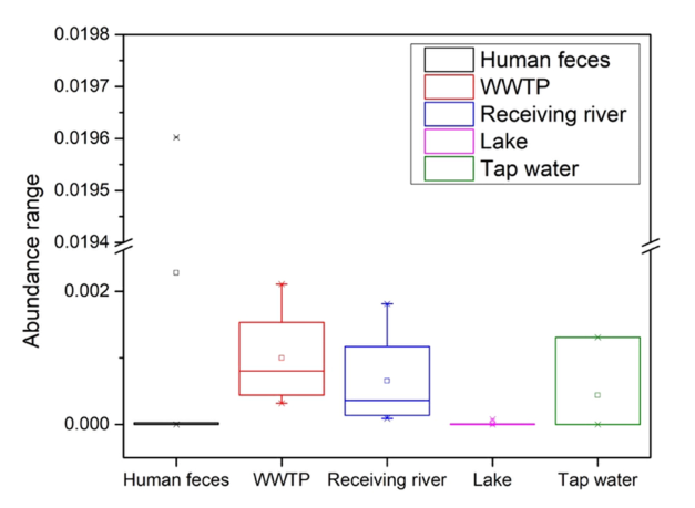 借助人類糞便指示劑 crAssphage (CPQ_056),分析了人類糞便排放對當(dāng)?shù)厮h(huán)境中ARGs的影響。結(jié)果表明,crAssphage在所有環(huán)境樣品中的檢測頻率為 68.2%,相對豐度范圍為2.68×10-6至1.96×10-2每個16S rRNA基因拷貝(圖2),表明超過一半的水樣(湖水、自來水、污水處理廠和受納河水)被人類糞便污染。與 ARGs 一致,平均crAssphage 豐度也沿著水流從污水處理廠不同處理單元的污水到受納河水再到湖泊水體的順序逐漸減少(圖2)。這再次證明了人類糞便污染從污水處理廠的排放源到接收環(huán)境有著隨距離不斷衰減的效應(yīng)。